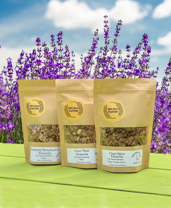 All of Selma’s Pantry Granolas are home roasted and include a base of old-fashioned oats, sunflower and pumpkin seeds and are sweetened lightly with brown sugar and maple syrup.